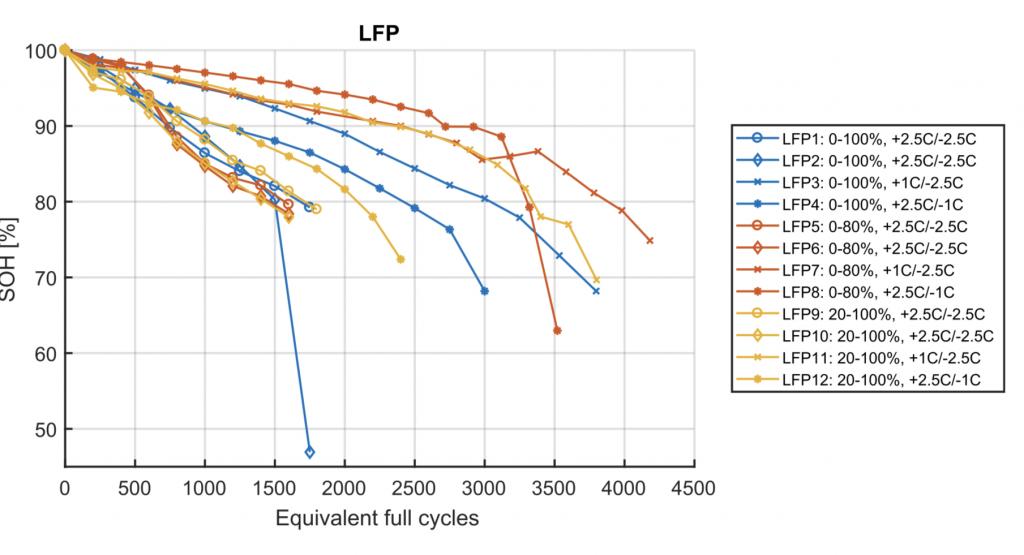 Men lithiumbatterier har 80% SOH som ”End of life” i branschen. I princip alla tillverkare räknar 80% som end of life, och i forksningen ser vi i de fall man testar förbi 20% degradering att batterierna ofta får en knäck vid cirka 80% capacitet som viket kraftigt nedåt.