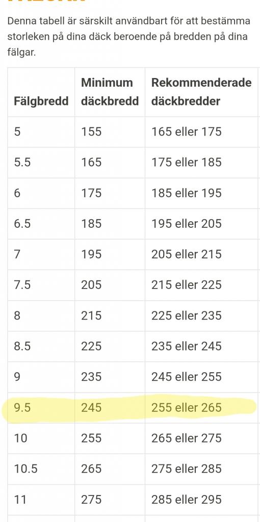 Model Y har 9,5" breda originalfälgar och rekommenderad däckbredd är 255 eller 265
