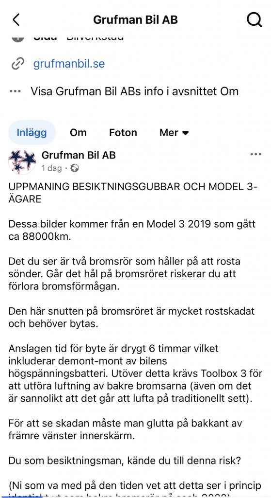 Tydligen så är det en skyddsslang som är för kort som gör att röret blir oskyddat. Stänkskydd hjälper inte mot fukten. Preliminärt lutar det åt att alla 3:or mellan 2019-2021 har problemet. Kan även vara på senare modeller.Buzz skrev: ↑23 okt 2024 21:20Hände min 2019 med drygt 5500 på mätaren. Drabbar troligtvis de bilar som levererades utan stänkskydd då det samlas otroligt mycket skit bakom innerskärmen långt in i tröskeln. Tesla sa själva att dom uppdaterat just detta bromsrör, utan att nämna om det är själva korrosionsskyddet som blivit bättre.