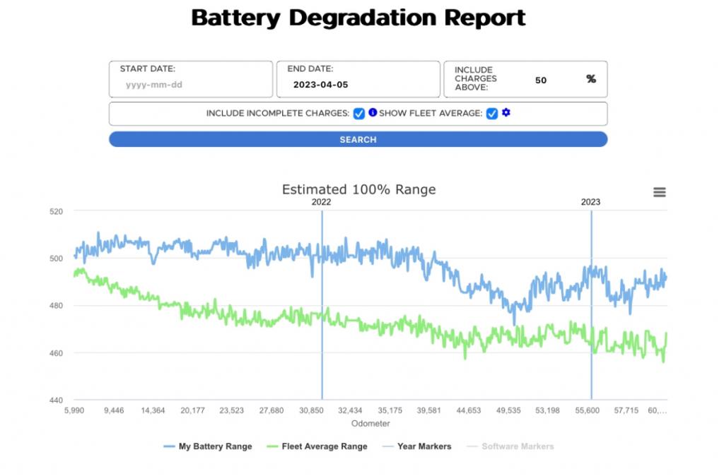 Den displayade räckvidden har minskat från 507km till ~462km på inte mer än 2.5 år (eftersom den modellen helt sonika inte fanns innan är de äldsta bilarna 2.5 år och andra yngre). Bilmodellen döljer någon procent degradering innan rangen minskar.
