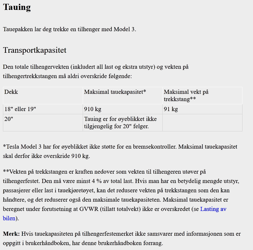 Märks att Tesla inte har koll på marknaden då de pratar om bromskontroller (för vad jag förstår är släpar med elektroniskt styrda bromsar) i den norska instruktionsboken. Eller rättare sagt avsaknaden av denna och att dragvikten därför är begränsad till 910 kg. Skulle vara intressant att veta vad de tycker en bromsad släp kan väga.