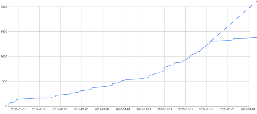 Idag finns det 1 382 Supercharger stolpar i drift i Sverige. Skulle Tesla ha fortsatt utbyggnaden i samma takt som i början av 2024 skulle det ha funnits över 2 100 Supercharger snabbladdare nu. Lågt räknat, i och med att utbyggnadstakten har gått allt snabbare för varje år. Om trendlinjen istället följer den exponentiella tillväxten skulle vi nu haft över 2 500 Superchargers.