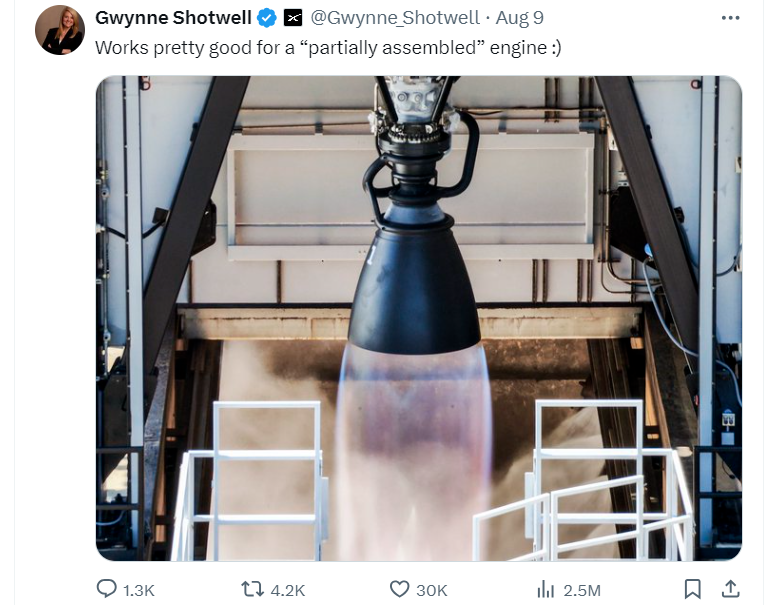 Det pinsamma i hans inlägg var dock att Raptor 3 är inte alls halvmonterad, den är precis så enkel och clean som den ser ut på bild. Vilket bevisades av SpaceX vice verkställande direktör Gwynne Shotwells retsamma svar med en bild på Raptor 3 testkörning: “Fungerar ganska bra för en “delvis monterad” motor”