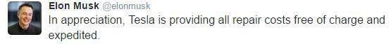 Historien om hjälteinsatsen spred sig snabbt på Internet. När det nådde Teslas VD Elon Musks öron erbjöd han snabbt att Tesla står för reparationerna av den skadade Teslan.